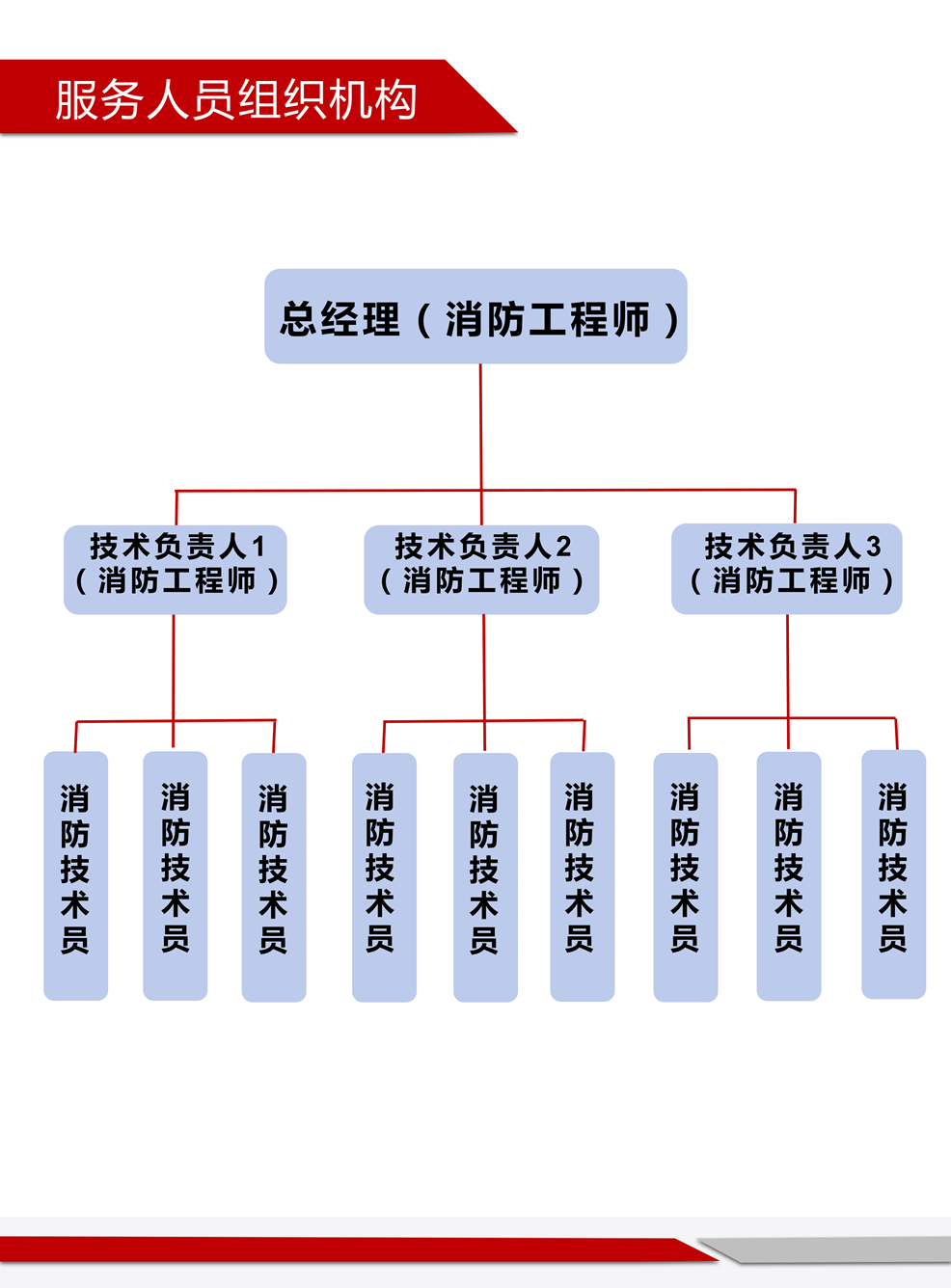 目前公司各类专业管理人员配备齐全,具有完善的组织架构,公司设董事长1人、总经理1人,内设综合部、财务部、工程部、消防技术服务部等部门,其中具有多年施工及消防技术服务经验的一级建造师、二级建造师、高级及中级工程师、一级消防工程师、消防员等各专业管理与技术人员30余人,配备了信息网络化办公系统,建立了高效的决策、施工、管理运行机制。