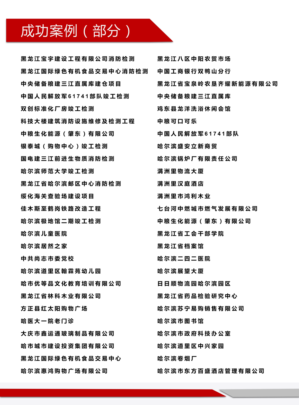公司自成立以来,在消防设施施工、消防技术服务等行业中异军突起,在本地及外埠承接了大量消防改造、消防检测、消防维保等项目,具有代表性的哈尔滨公安医院消防改造项目、哈尔滨市图书馆消防施工项目、哈尔滨银泰城购物中心消防检测、哈尔滨日日顺物流消防维保、哈尔滨卷烟厂消防维保等,取得了良好的成绩,在客户中赢得了较高的声誉,给公司焕发了生机和活力。